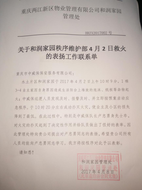 2017年4月2日上午10時9分,中威保駐和潤家園小區(qū)保安員巡邏時發(fā)現(xiàn)1棟業(yè)主起火情況,及時報警,并立即按預(yù)案啟動應(yīng)急程序,只花了11分鐘的時間就把火撲滅了,使業(yè)主及小區(qū)的損失降到了最低。在此過程中,分隊(duì)長盧忠勇身先士卒,對火災(zāi)的撲滅起到了決定性作用,并給隊(duì)員做了好的表率。因此甲方特發(fā)來表揚(yáng)信對盧忠勇表示了贊揚(yáng)。