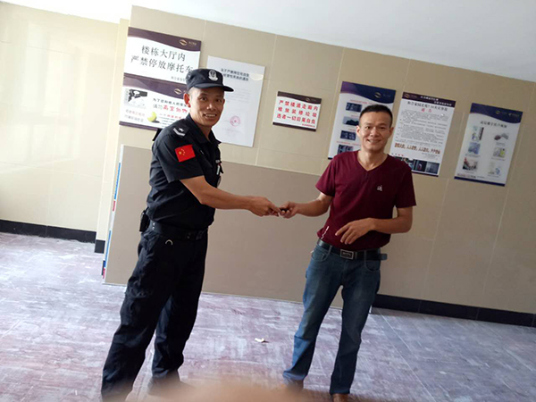 8月14日下午13點(diǎn)35分左右,和合三期值班保安黃永術(shù)在19幢拾得蘋果手機(jī)一部,想著失主很著急,手機(jī)里信息多,就在大廳來(lái)回走動(dòng),耐心等待失主來(lái)認(rèn)領(lǐng),大約過了20分鐘,一位姓曾的男子勿勿趕來(lái),"保安大哥,看見一部蘋果手機(jī)沒有?”在確認(rèn)了男子的身份后,黃永術(shù)將手機(jī)“完璧歸趙”。心急如焚的曾先生拿到失而復(fù)得的手機(jī)后,激動(dòng)地一個(gè)勁兒說(shuō)謝謝。
